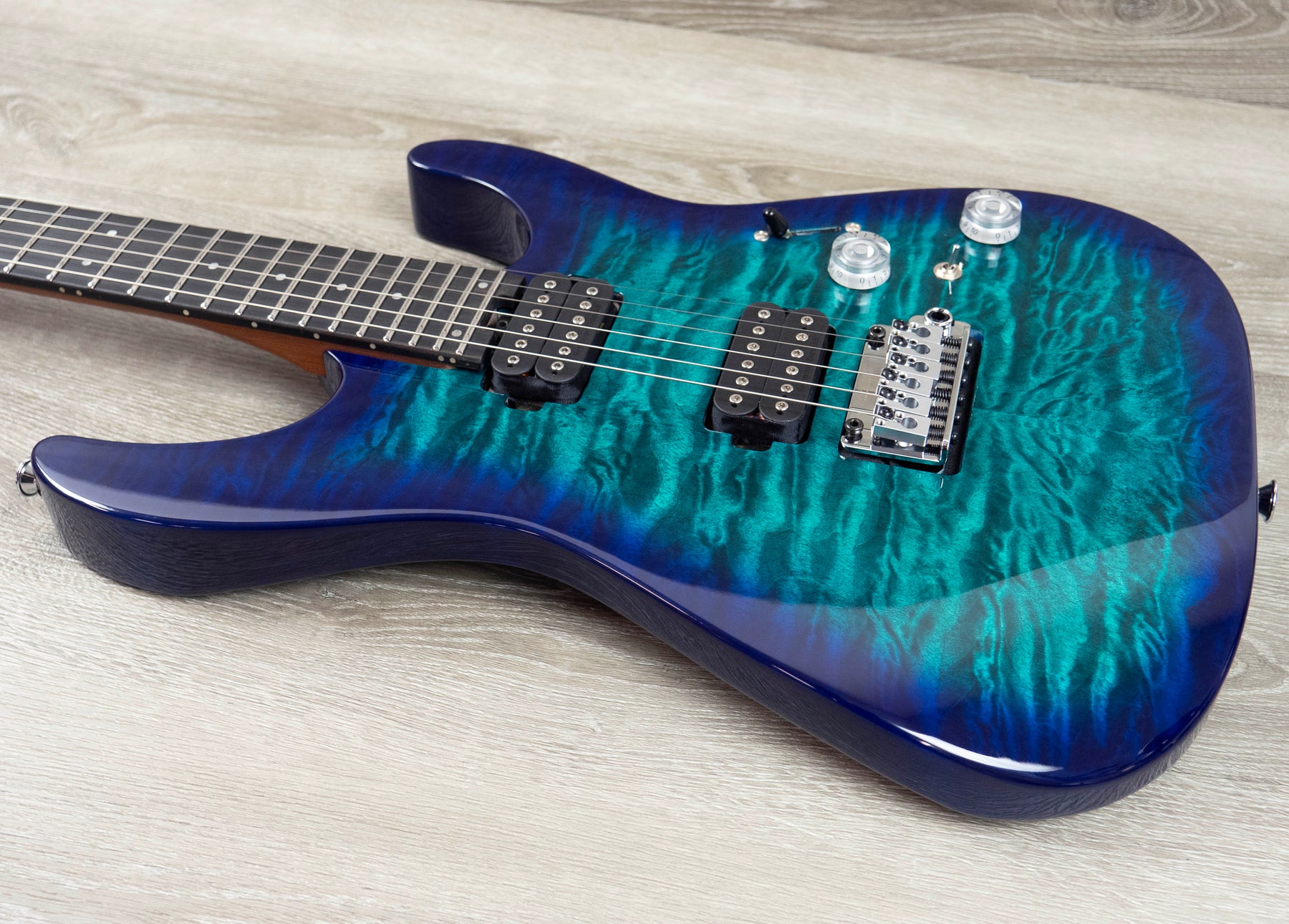 Loaded with premium features, this Pro-Mod Plus Dinky DK24 2PT model features a sleek Dinky body constructed from basswood with a quilt maple top, sculpted shredder's cut heel and scalloped lower back bout for seamless access to the upper registers. The bolt-on caramelized maple neck features graphite reinforcement for rock-solid stability, a satin natural finish on the back of the neck for sublime playability, and a conveniently located heel-mount truss rod adjustment wheel for neck relief tweaks on the fly. Designed for speed, the 12"-16" compound radius ebony fingerboard features comfortable rolled edges, 24 stainless steel jumbo frets and Luminlay side-dots for enhanced visibility in low-light conditions.