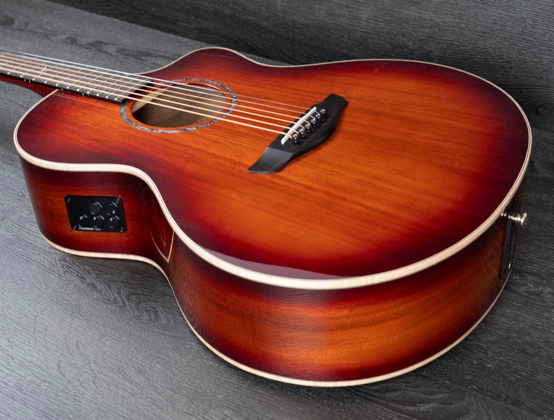 Le Neptune Blood Moon est un magnifique instrument qui utilise uniquement le meilleur Trembesi javanais figuré pour la table, le dos et les éclisses. Ce bois indigène indonésien est utilisé depuis longtemps par les ébénistes pour son apparence époustouflante, mais nous sommes également convaincus de ses propriétés sonores depuis un bon moment.