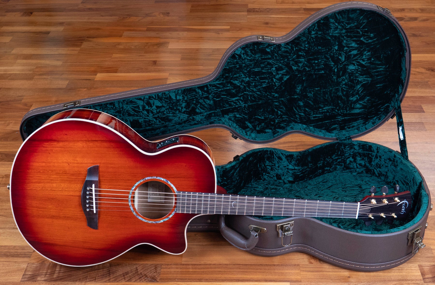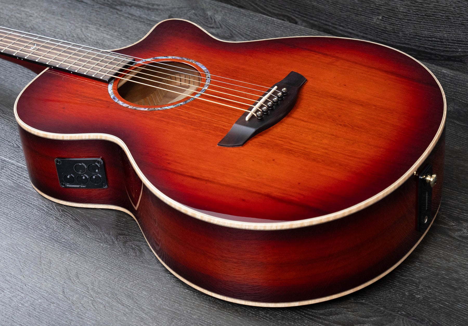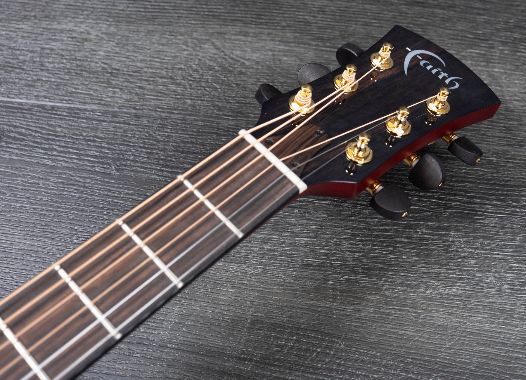 Le Venus Blood Moon est un magnifique instrument qui utilise uniquement le meilleur Trembesi javanais figuré pour la table, le dos et les éclisses. Ce bois indigène indonésien est utilisé depuis longtemps par les fabricants de meubles pour son apparence époustouflante, mais nous sommes également convaincus de ses propriétés sonores depuis un bon moment.